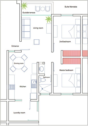 The master bedroom has a queen size bed and the second bedroom a double bed. One sofa bed in the living room, air conditioner in living room and each bedroom, a 32" inches flat screen, ceiling fans in living room and each bedroom, safe-deposit box and laundry room.