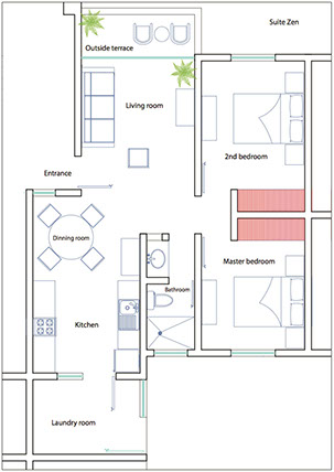 The master bedroom has a queen size bed and the second bedroom a double bed. One sofa bed in the living room, air conditioner in living room and each bedroom, a 32" inches flat screen, ceiling fans in living room and each bedroom, safe-deposit box and laundry room.