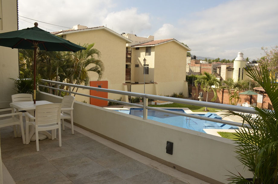 Suite de dos recámaras con terraza privada en segundo nivel (vista a la alberca) totalmente amueblada, WiFi, televisión por cable y utensilios de cocina. La recámara principal cuenta con cama queen size y la segunda con cama matrimonial, sofá cama en sala, terraza privada amueblada, aire acondicionado en sala y en cada recámara, televisión de 32 pulgadas de pantalla plana, ventiladores de techo en sala y recámaras, caja de seguridad y lavandería.